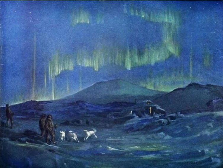 In 1908, all through his first Antarctic winter, Marston used oil paints to grab the the southern dawn. In his atmospheric scene the air stays to be, the night is clear and sled canine frolic throughout the snow beneath the blue/inexperienced glow of the moonlight and the aurora. The Cape Royds expedition hut (now a protected historic website online) blends into the hillside whereas three males brave the chilly to have a look at the lights perform over Mount Erebus.