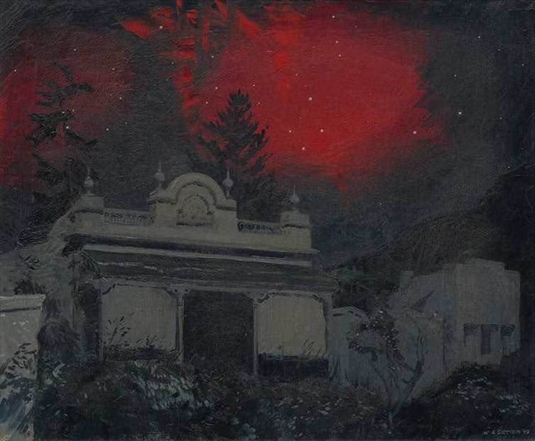 His work Aurora at Arrowtown (1949), painted early in his career, contrasts alongside together with his later expansive mountain scenes and abstracted landscapes. The greyed Arrowtown buildings are barely seen throughout the gloomy half-light. Like a portent of doom, a glowing blood-red aurora looms ominously over the town.