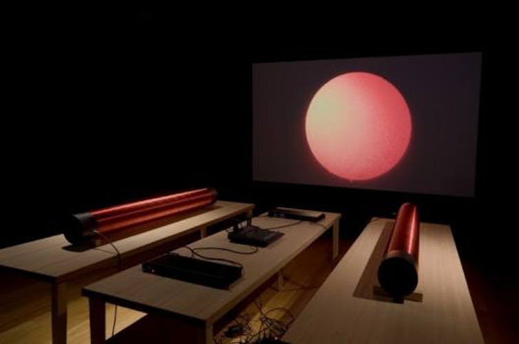 The work blended sight, sound and scent. A video projection of the Photo voltaic’s flooring, recorded through a hydrogen-alpha telescope lens, confirmed the ingredient of the Photo voltaic’s corona and the ejections of material which will set off auroral train. Copper-coiled antennas tuned to detect electromagnetic train had been hooked as a lot as amplifiers that emitted audible pops and sizzles of invisible vitality.
